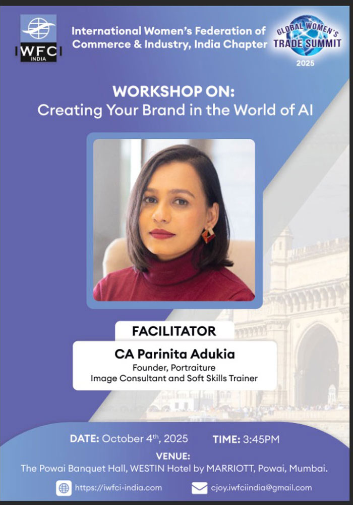 We are thrilled to announce CA Parinita Adukia, Founder, Portraiture, Image Consultant & Soft Skills Trainer, as the facilitator for our upcoming workshop, “Creating Your Brand in the World of AI” at the Global Women’s Trade Summit (GWTS- 2025).